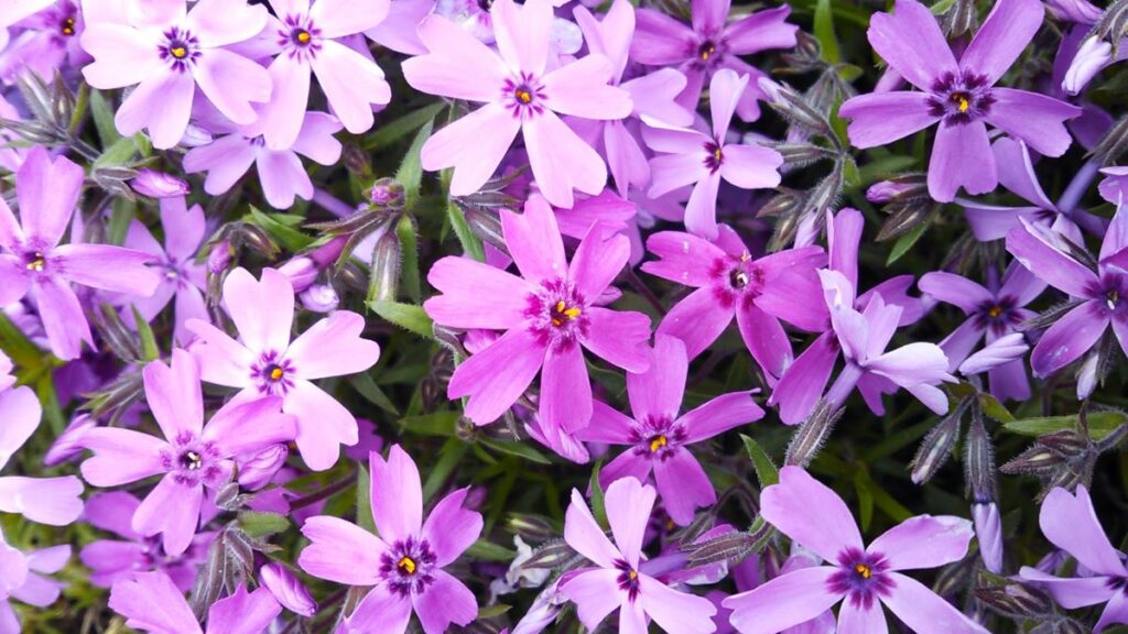 シバザクラの花言葉は「臆病な心」「合意」「一致」「忍耐」「燃える恋」「華やかな姿」「一筋」だそうです。ハナシノブ科の多年草で、4・5月頃にサクラに似た形の淡桃、赤、薄紫、あるいは白色の花を咲かせます。